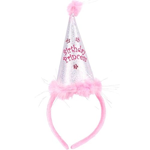 -. Feature : Features a silver, holographic cone with pretty flowers, a hot pink "Birthday P.R.Incess" headline, a pink pom pom top and a matching marabou trim adorned with silver tinsel. / With a matching pink felt covered plastic headband. / Perfect for birthday parties, theme parties, and playing dress-up. / Measures 10" x 7", fits most children