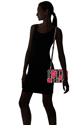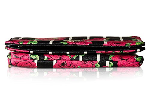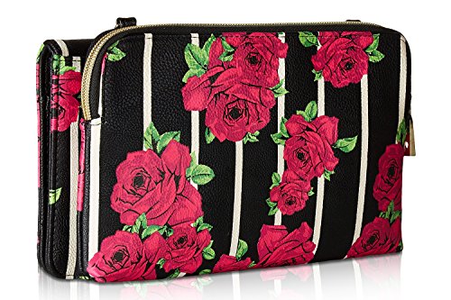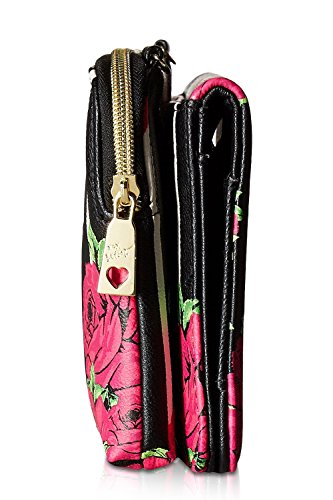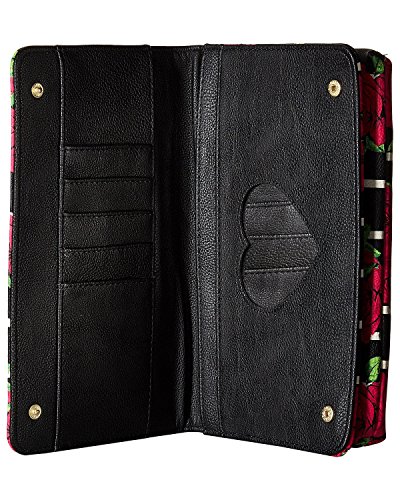 For the perfect blend of fashion and function, get the stylish Betsey Johnson wallet on string. Its constructed of all soft faux leather printed exterior, featuring Top zipper open pocket with wall zip and 2 slip pockets, snap front flap pocket with 2 bill, 6 credit card and heart mirror detail, adjustable removable cross-body strap offers security while wearing.