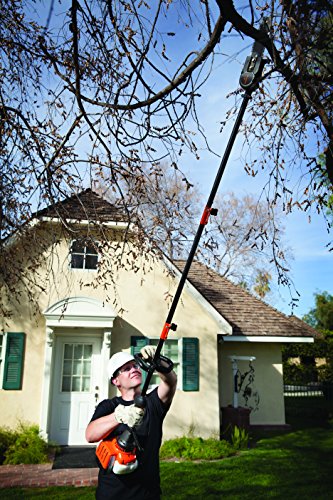 - Feature : This gas pole saw is an easy-to-use design used to cut limbs and branches without the need of a ladder / 25cc 2-cycle engine has plenty of power to conquer tough tasks / 8-inch bar and chain are mounted on a 7-foot extention pole, allowing the user to reach up to 12 feet / The auto oiler maks sure the chain is always properly lubricated / Accepts most attachments, which turn this saw into a blower, hedge trimmer, edger, and more
