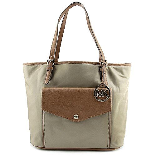 -. Brand : MICHAEL -. ClothingSize : US -. Color : Dusk -. Department : womens -. EAN : 0889154938557 -. Feature : brown nylon fabric with lage brown leather trim and gold toned hardware / Monogram P.R.Int lined interiors with a central zippered padded wall pocket and two large open compartments / Inner zippered pocket and four open slip pockets; front flap pocket with magnetic snap closure features 6 card slots / Dual leather straps with a drop of about 8 inches; Protective feet on bottom / Measures approximately 12 in (L) at the bottom tapering to 15 in (L) at the top x 11 in (H) x 6 in (W) -. Label : Michael -. Manufacturer : Michael -. Model : 5H5GJ2T3C-DUSK -. MPN : 889154938557 -. NumberOfItems : 1 -. PackageQuantity : 1 -. PartNumber : 889154938557 -. ProductGroup : Shoes -. ProductTypeName : HANDBAG -. Publisher : Michael -. Size : One Size -. Studio : Michael -. Title : Jet Set Nylon Pocket Tote - Dusk/Saddle -. UPC : 889154938557
