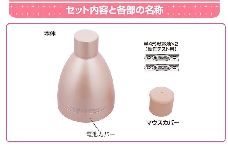 | ご使用方法 | 1.本体の先端部にマウスカバーを取り付けてください。 2.本体をしっかり持って、電源ボタンを押す。電源が入り、イージーモードが始まります。 3.ボタンを押すたびにモードが切り替わるので、目的に応じてモードを選んでください。(各1〜3分) 4.電源ボタンを上にして本体を手で添えながら、先端部を唇でくわえてください。 5.添えていた手は離して、顔を正面に向けてください。 6.トレーニングが終了しましたら、本体からマウスカバーを外し、マウスカバーを食器用洗剤などで洗ってから保管してください。マウスカバーを本体に装着した状態で洗うことも可能です。その場合は本体先端部のみ洗ってください。 |
