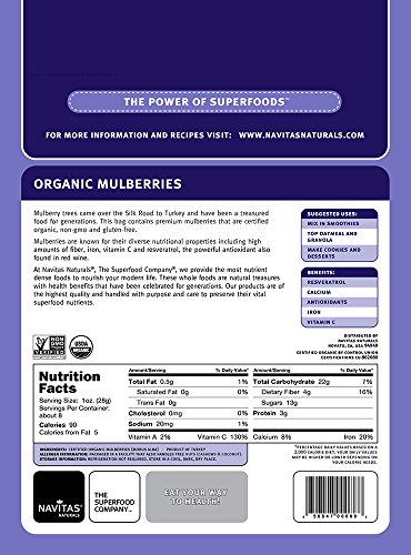 -. Feature : 100% certified organic, kosher, non-GMO, certified gluten-free, vegan and raw / Dried white mulberries are known for their high level of antioxidants, including resveratrol - the famous nutrient in red wine / The dried berries are an excellent source of vitamin C and contain 3 grams of protein per serving and a plentiful amount of iron, fiber and calcium / Enjoy these sweet low-sugar berries as a snack, or enhance your trail mix, granola, yogurt, smoothies, energy bars, baked goods, and salads / Food for modern life. Great for home consumption or use in your healthy restaurant or café.