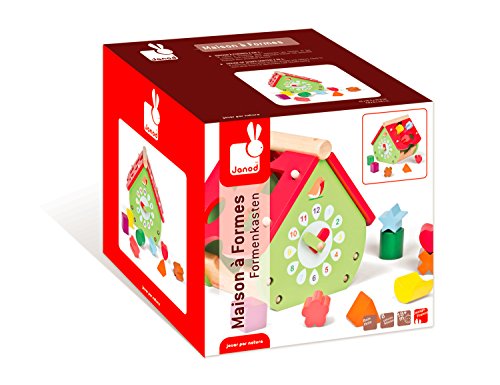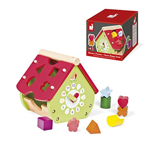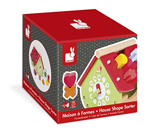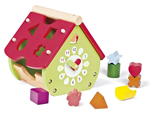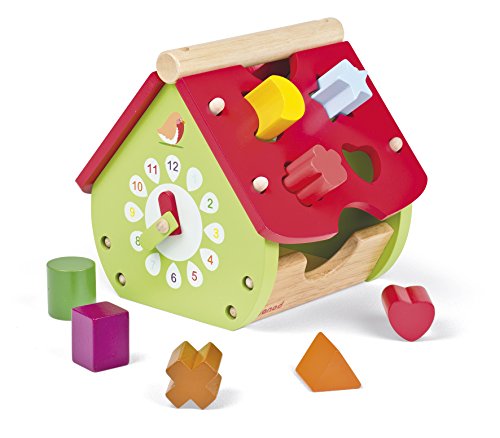Janod garden house of shape sorter is a bright and colorful way to learn! little ones match the shapes of the blocks to the holes in the roof, and put them in. Once loaded, they can carry it around by the roof handle, then dump the pieces and start all over again. There's also a clock face on the front of the house, so you can teach your child how to tell time! the garden house measure 7.75in. Wide x 8in. High x 8in. Deep. Includes a house shaped sorter with 8 wooden shapes. Recommended for children 18 months of age and older.Feature