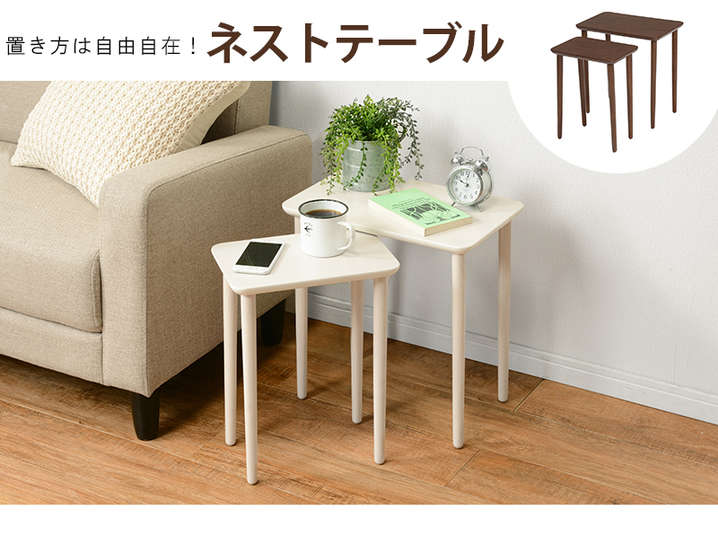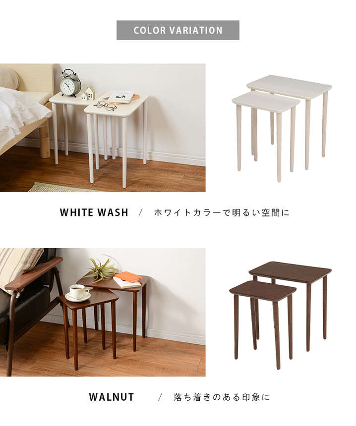 ●大小2個組のネストテーブル。玄関やソファーサイド、ベッドサイドでも置きやすいコンパクトサイズが魅力的。