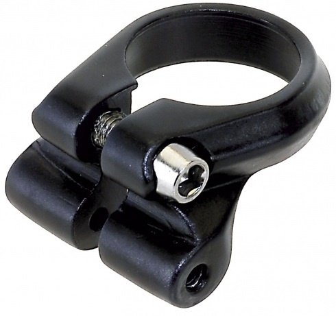 This unique seat tube clamp includes threads for mounting a carrier rack. Made of black alloy.