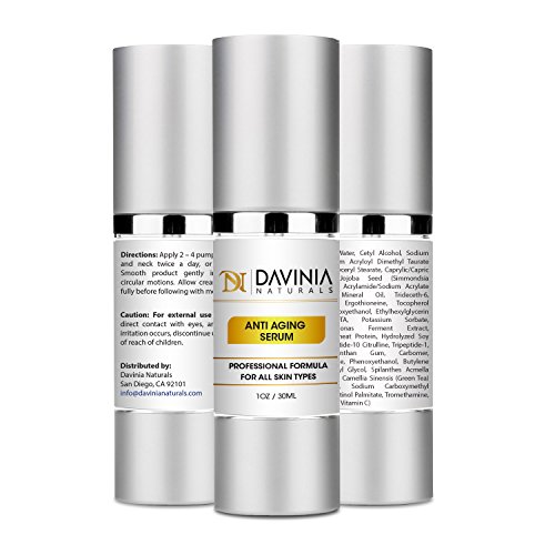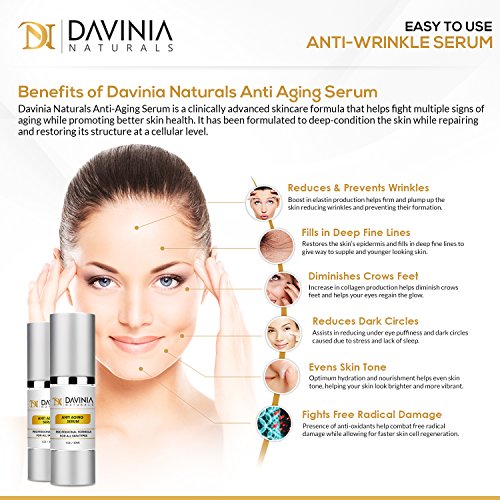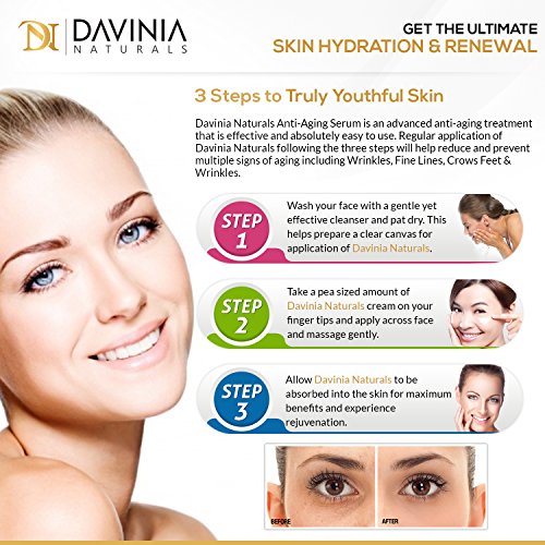 Experience younger looking skin like never before with Davinia Naturals. This anti aging serum improves collagen synthesis and will reduce the appearance of wrinkles, fine lines and dark circles.