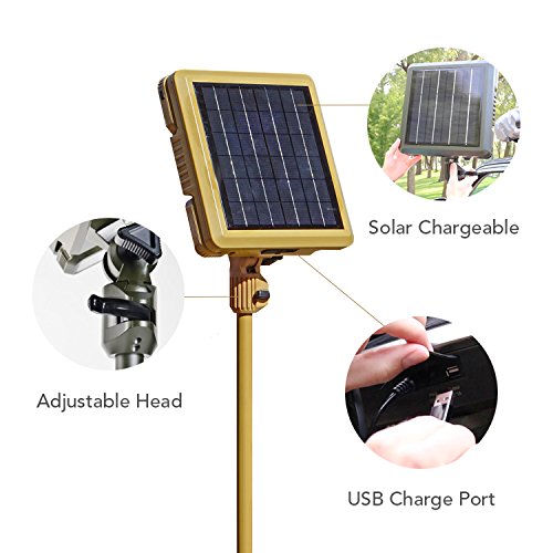 Features: waterproof construction, solar panel, rechargeable lithium ion battery, tripod stand with stakes, 4 mini pod lights with hanging hooks and magnets