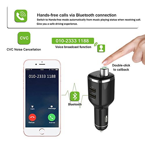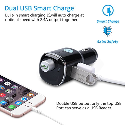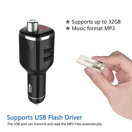 TWO MUSIC PLAY MODE: 1)Bluetooth Connection - Automatically and simply paired your phone with this device via stable Bluetooth. Bluetooth sound processing A2DP, offers a comfortable stereo music playing.2) MP3 Player - Insert USB Disk into the top USB Port, then automatically play and transmit the MP3 files(Up to 32GB); Playing music to relax your body and mind during your driving.