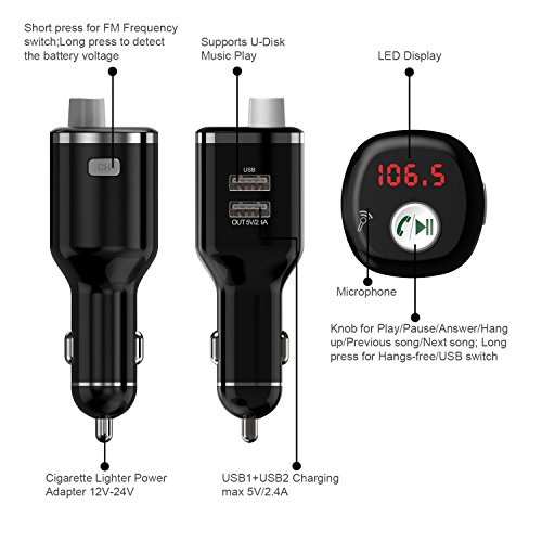 DUAL USB CAR CHARGER: Support charging two devices simultaneously by the dual USB ports which output 2.4A total. Built-in smart charging IC, will auto detect your devices and charge all cellphone or iPads at optimal speed, without damage to the battery. Red LED digital screen display of FM frequency and car voltage.