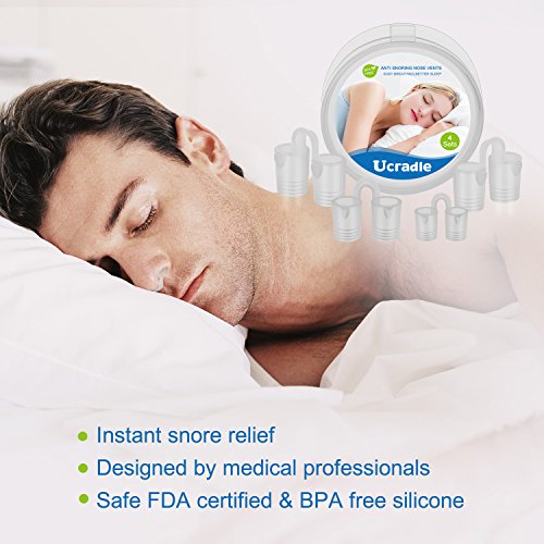 Studio : Ucradle Publisher : Ucradle Binding : Health and Beauty Product Description Did you suffering from snoring? No worries any more with Ucradle Nose Vents. Easy Stop Snoring Solution The Ucradle Nose Vents is designed to maximize airflow through the nasal passage and stop snoring,it's the safest and most effective solution for the treatment of snoring. How to use it? 1>Choose an appropriate size 2>Gently insert the vent into your nose 3>For first time users,we recommend wearing the device for a couple of hours during the day to get used to it. Cleaning Instructions Clean the Ucradle nose vents throughly with water/soap and dry it. Store this device in the protective case to keep clean and safe when not in use. Package Includes ? 4 Nose Vents - Small, Medium, Large, X-Large ? 1 Plastic Hygiene Case