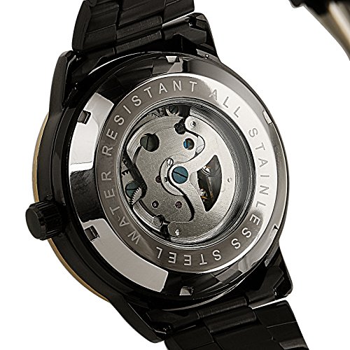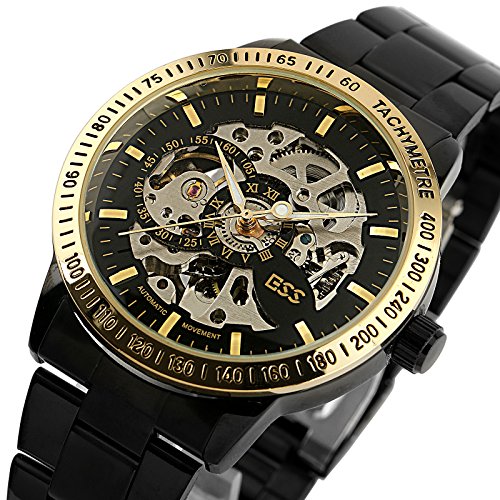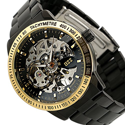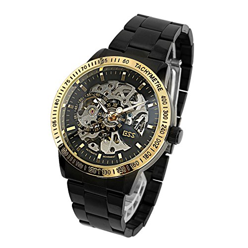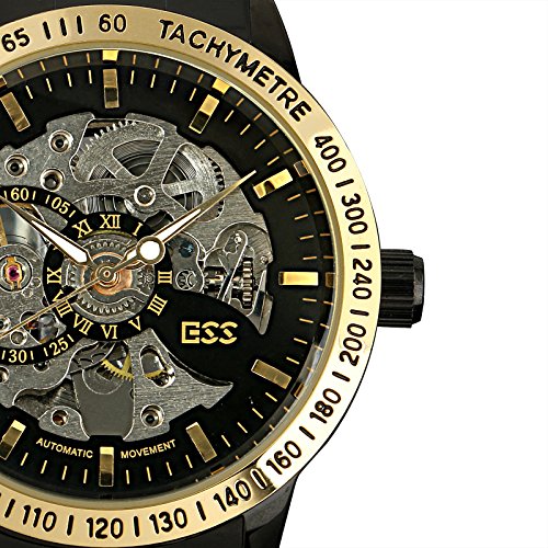 -. Title : ESS Men's Black Strap Watch Skeleton Mechanical Wrist Automatic Movement Stainless Steel Golden Case