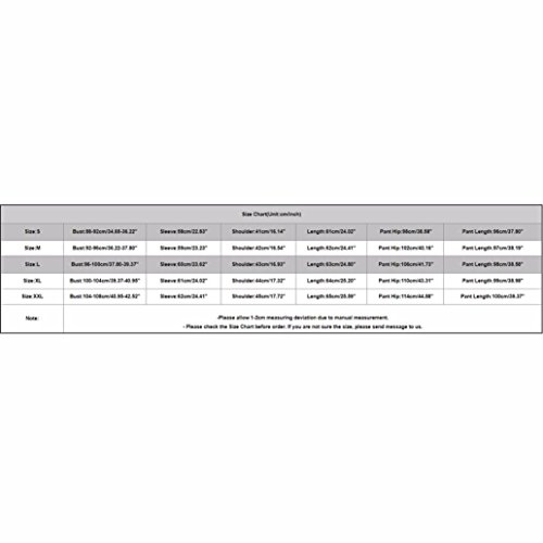 NOTE: Please compare the detail sizes with yours before you buy!!! Use similar clothing to compare with the size. Product information: Season:Spring,Autumn,Winter Gender: Women Occasion: Casual Material: Polyester Decoration:None Clothing Length: Regular Pattern Type: Camouflage Style: Fashion,Causal Collar:Hooded Weight:510g What you get: 1*Women Tops Pants Size Details (1 "= 2.54cm) Size:S----Bust:88-92cm/34.65-36.22"------Sleeve:58cm/22.83"----Shoulder:41cm/16.14"-------Length:61cm/24.02"-------Pant Hip:98cm/38.58"------Pant Length:96cm/37.80" Size:M---Bust:92-96cm/36.22-37.80"------Sleeve:59cm/23.23"----Shoulder:42cm/16.54"-------Length:62cm/24.41"------- Pant Hip:102cm/40.16"---Pant Length:97cm/38.19" Size:L---Bust:96-100cm/37.80-39.37"-----Sleeve:60cm/23.62"----Shoulder:43cm/16.93"-------Length:63cm/24.80"-------Pant Hip:106cm/41.73"----Pant Length:98cm/38.58" Size:XL---Bust:100-104cm/39.37-40.95"---Sleeve:61cm/24.02"----Shoulder:44cm/17.32"-------Length:64cm/25.20"-------Pant Hip:110cm/43.31"----Pant Length:99cm/38.98" Size:XXL--Bust:104-108cm/40.95-42.52"--Sleeve:62cm/24.41"----Shoulder:45cm/17.72"-------Length:65cm/25.59"------Pant Hip:114cm/44.88"----Pant Length:100cm/39.37" ! Attention Please: All dimensions are measured by hand, there may be 2-3cm deviations. Please ignore the tag size comes with the cloth. The tag size sometimes can be a larger than our description size because those are for Chinese. We are 1 or 2 sizes smaller than European and American people. 0