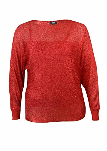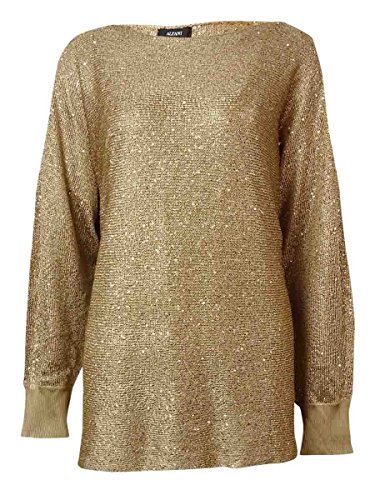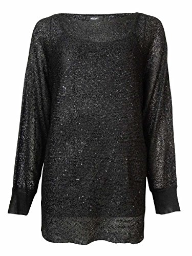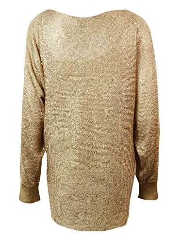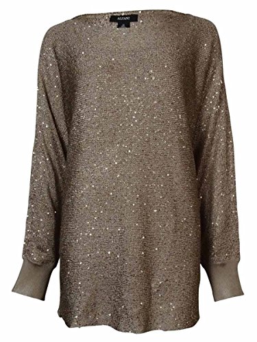 Top features full tank lining, round neck, dolman sleeves, sequined knit metallic fabric, and pullover style.
