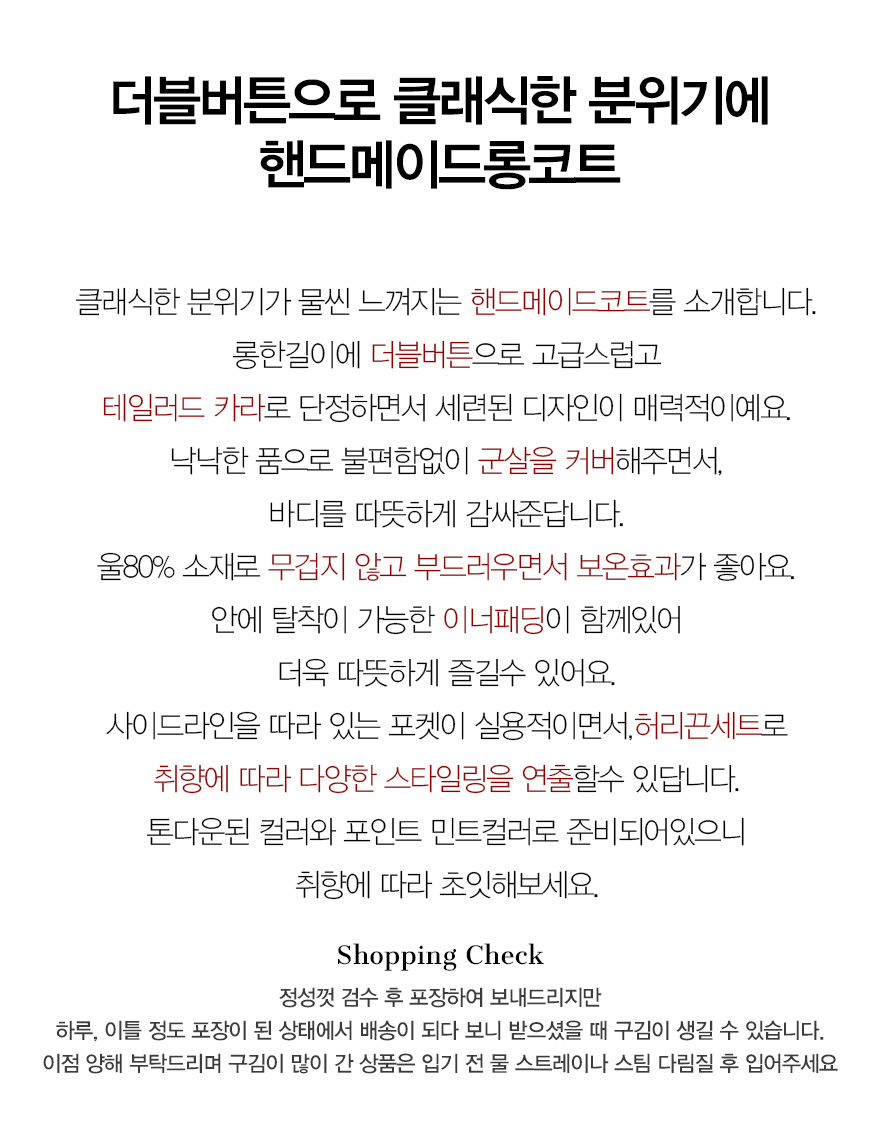 배송 받으실 때까지 예쁜 핏 그대로 받아 보실 수 있도록 카라 부분을 실로 고정하거나 주머니를 막아 놓은 부분이 있습니다.