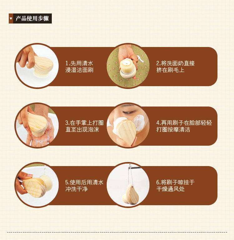 | 使用方法 | ①先用清水浸湿洁面刷;②将洗面奶挤在刷毛上,并在手掌上打圈至出现泡沫;③再用刷子在脸部轻轻打圈按摩,清洁面部皮肤。 ④使用后将刷子用清水冲洗干净,并挂于干燥通风处(注意避免阳光直射影响使用寿命)。 | |||