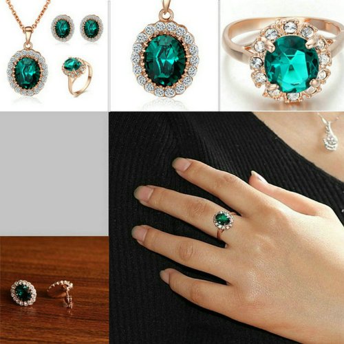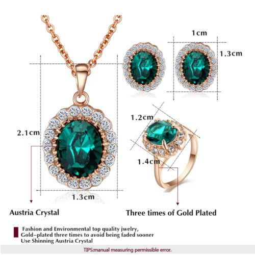 -. Feature : This set will be a good gift. Shipped out in an exquisite jewelry gift box which can be used as a gift directly. Need no other packing. / This set consists a necklace, a size 8 ring and a pair of stud earrings. Oval emerald accents with Austrian crystals around it with shinning gloss. Three layers of 18K rose gold plated, polished finish and tarnish free. / The set is a perfect accessory to your outfit or as an excellent gift for anniversaries, graduations, birthdays, or just as a surP.R.Ise to remind that special someone how much you care. / The necklace chain is 15.7' long. The necklace pendant size is 0.8''*0.5''. The earring size is 0.5''*0.4''. The ring stone size is 0.5''*0.4''. / The delivery date is about 3-8 days by AZ fulfilment Center.One year warranty to ensure you a perfect shopping experience.