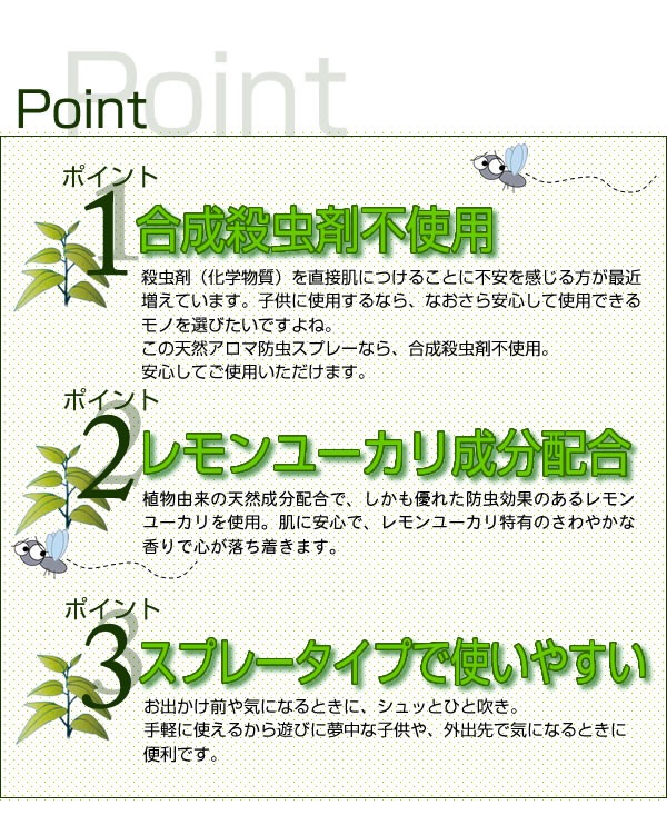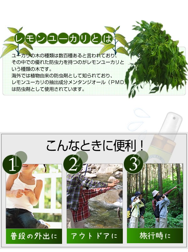 植物由来の天然成分配合!しかも優れた防虫効果のあるレモンユーカリを使用。肌に安心で、レモンユーカリ特有のさわやかな香りで心が落ち着きます。シュッとひと吹き、手軽に使えます。