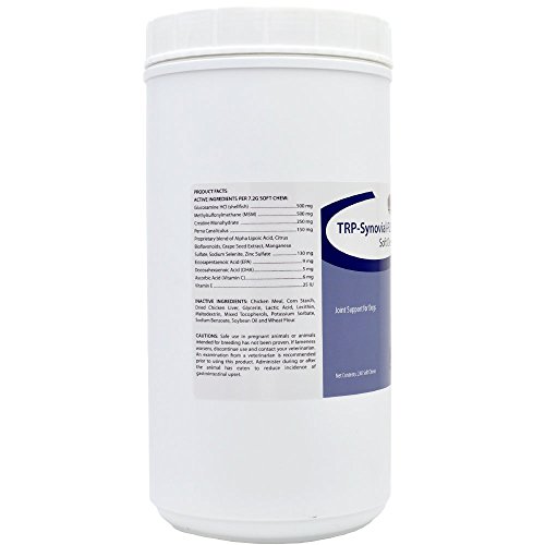 -. Binding : Misc. -. Brand : Synovial - Flex -. Feature : Synovial-Flex Soft Chews for dogs is recommended to support healthy joint function in dogs. / May help alleviate the pain associated with normal daily exercise and activity. / It's a comprehensive nutritional supplement that combines Glucosamine HCl, Perna Canaliculus, MSM and Omega-3 Fatty Acids, Antioxidants, Vitamins and Minerals in a delicious treat like chew. -. Label : Vitality Systems -. Manufacturer : Vitality Systems -. MPN : FNGL240 -. PackageQuantity : 240 -. PartNumber : FNGL240 -. ProductGroup : Pet Products -. ProductTypeName : PET_SUPPLIES -. Publisher : Vitality Systems -. Studio : Vitality Systems -. Title : Synovial-Flex Soft Chews (240 COUNT)