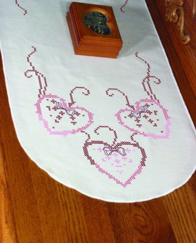 Fairway has been in the stitchery business for over 90 years. All of our products are proudly made in the USA. These easy to stitch, Cross Stitch Three Hearts Design 15 by 42-inch will make a beautiful Dresser Scarf. Package includes one stamped for embroidery dresser scarf with washable ink, floss requirements, and stitching instructions. The perle edge dresser scarf is 15 by 42-inch.Feature