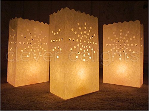 CleverDelights White Luminary Bags - 100 Count - Sunburst Design - Wedding, Reception, Party and Event Decor - Flame Resistant Paper - Luminaria