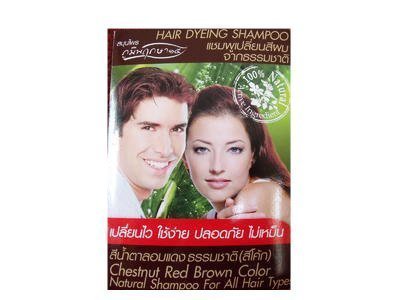 From natural herbal extracts. So do not ruin your hair and scalp. Makes hair soft, shiny hair and long lasting fragrance of chemical safety. Gentle to hair and scalp. Hair Care soft and shiny with natural forces. The hair was close. Provide Hair color outstanding. How to use Just three simple steps for hair to close white hair or change hair color. Step 1: Always wash your hair with shampoo as normal before. To remove dirt and oil, then wash your hair with Herbal Shampoo hair color.It will change color faster and easier. Step 2: Wear gloves to tear bag of two channels are mixed together in your hands. Grease all over your head, rub lightly as hair wash Normally. Time off for 5 - 10 minutes, then rinse with clean water. If hair is thick should take the time up. Long hair should use the second pack. Step 3: After washing hair, dry hair or blow dry. You have natural black hair. If it is white and hair grew up. It can be used to shampoo hair color again. More information. ####Pure Sesame Oil sesame oil. Sesame oil to make hair grow faster. Maintain healthy hair. Keeps hairmoisturize hair soft, not dry hair split and shiny black hair. ####Natural Henna It features a natural dark hair color to reduce dandruff, eczema, ringworm, fungus, reduce bacteria on the scalp. ####Chinese herbs:: Polygonum Multiorum Root extract that is known for the treatment of healthy hair. Not dry or broken easily and help prevent hair loss. Protection from UVA rays as well ## Allergy testing Apply a small amount of cream to the mix. The area behind the ear. Or in crook of elbow. Apply it about 24 to 48 hours if reaction:: redness or swelling, do not use .## Instructions for safety 1. Avoid contact with eyes 2. Do not use while scalp wound, rash or inflammation 3.If your allergic products Hair coloring. Should not be used immediately 4. Should be tested for allergic reaction before use 6. Do not use on eyelashes and eyebrows 7. Keep away from children and should stored in cool placeFeature