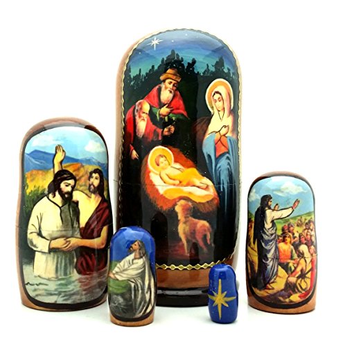 -. Feature : Jesus Life Nesting Doll 5 piece set Nativity Baptism Transfiguration Crucifixion Resurrection Ascension / Images are made using a high quality polygraphic machine / P.R.Int and painted / Size: 4"H, 2"W, set of 5, Hand made in Russia / Hand made in Russia / Quick (1-2 day) handleing time. Shipping from Los Angeles, CA. Combine shipping / Shipping fro each next item from BuyRussianGifts store is just $0.99