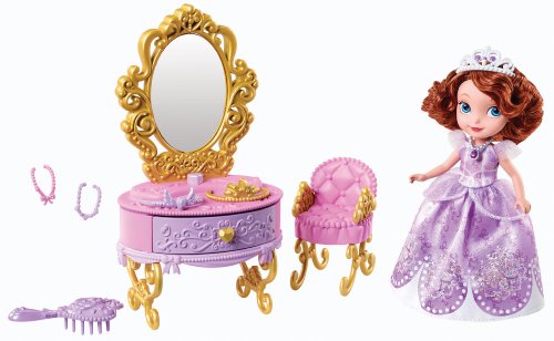 -. Feature : Based on the hit new animated series from Disney Junior, Sofia the First / Sofia's journey as a P.R.Incess begins with her grand debut at the ball / Have Sofia get dressed at this regal vanity and look royal ready for the ball / Seated in the pink chair with its quilted detail and golden feet and arms, Sofia can apply the finishing touches for any royal event / Girls will love recreating their favorite scenes from the show