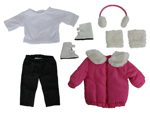 - Includes Pink Winter Jacket, White Shirt, Jeans, Boots, and Earmuffs