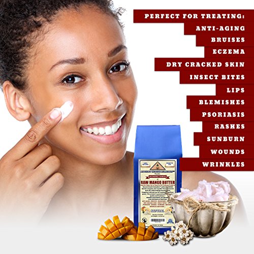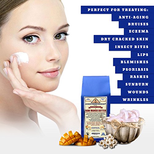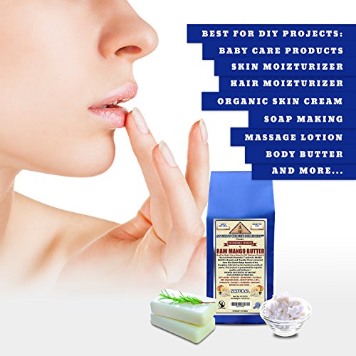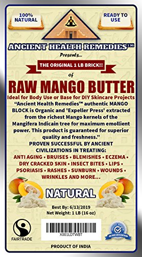Buy Ancient Health RemediesTM Lowest Price, Best Quality, Authentic, Organic, Unrefined, RAW MANGO BUTTER 1 LB (16 oz) Bulk, 100% Pure Expelled Pressed, Light Mango Seed Aroma, Best NON-GREASY Skincare Base for Beauty Care, Skin Moisturizing, DIY Base for Body Butters and Hair Products with Amazon's 'Satisfaction Guarantee allowing you to purchase with confidence and free Prime shipping. Mango kernel fat is an oil fraction obtained during the processing of MANGO BUTTER seeds of the tree Mangifera Indica. The oil is semi-solid at room temperatures, but melts on contact with living skin making it appealing for baby creams, sun care balms, hair products and other skin moisturizers. Mango fruits are a major source of edible food in many subtropical countries and globally. Fat is extracted from dried Mango kernels by hydraulic pressure. MANGO BUTTER has a very similar consistency to African Shea Butter but instead is non-greasy and softer in texture. Regarded a highly prized cosmetic emollient, MANGO BUTTER is an exceptional base ingredient for skincare, hair care or virtually any other Body Butter product. Raw MANGO BUTTER is the best all natural, organic alternative to popular, chemical based skincare creams and synthetic greasy body butters commonly sold in stores. All Natural Ingredient Base for All-Natural Cosmetics, Anti-Aging Cream, Babies Care Products, Beauty Products, Body Massage Oils, Body Lotion Making, Body Moisturizers, Handmade Body Butter Moisturizers, Healing Salves, Lip Balms, Organic Skincare Beauty Products, Natural Hair Products, Organic Shampoo, Stretch Cream and Whipped Body Butter Products. EVERYONE should use Ancient Health RemediesTM Organic MANGO BUTTER for healthy, youthful and pleasant feeling skin. Try yours today...hassle free, money back guaranteed and best legitimate price on Amazon.com. From Ancient Health RemediesTM', a company dedicated to the research and manufacture of the most successful, organic ancient health remedies of all time.Feature