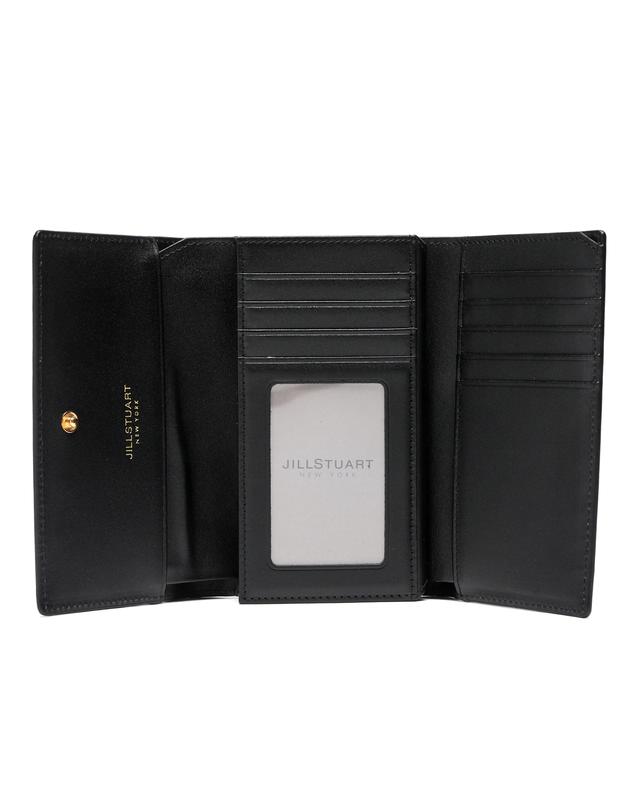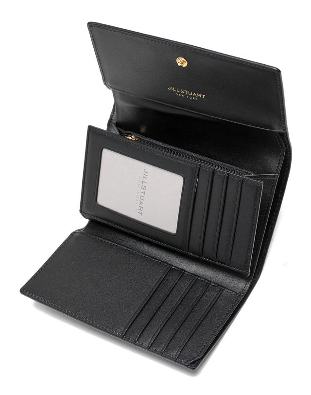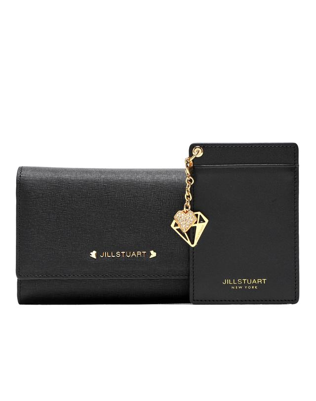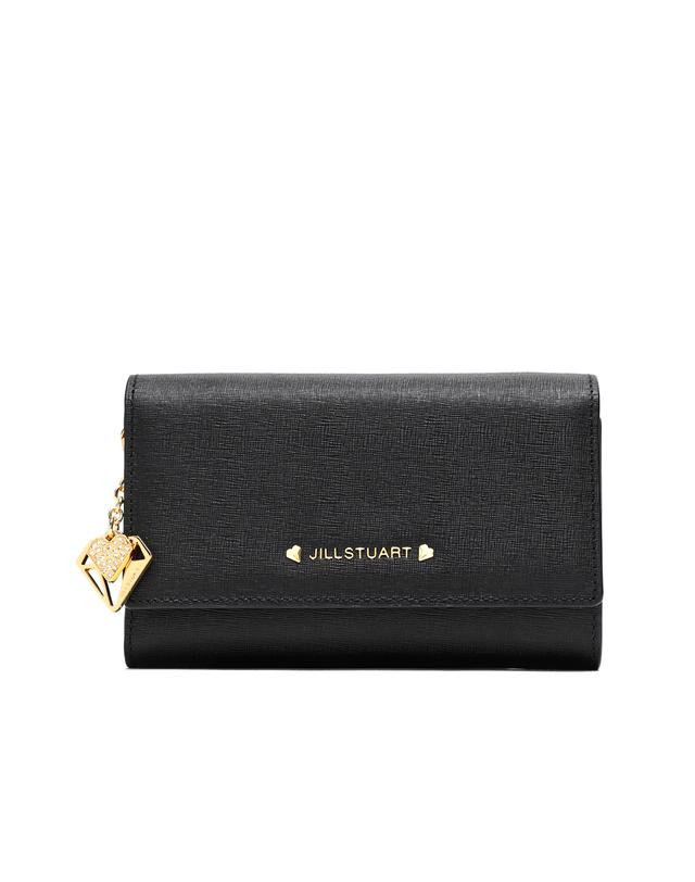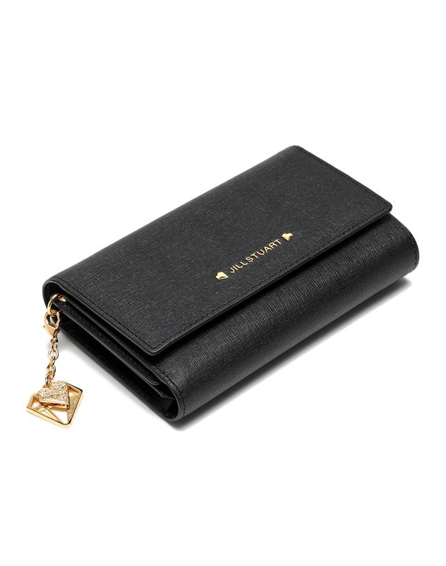 베이직한 블랙 솔리드 디자인에 하단 금장로고와 쁘띠 다이아몬드 참장식으로 포인트를 준 2단 반지갑 입니다.