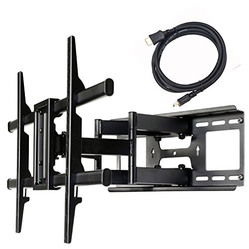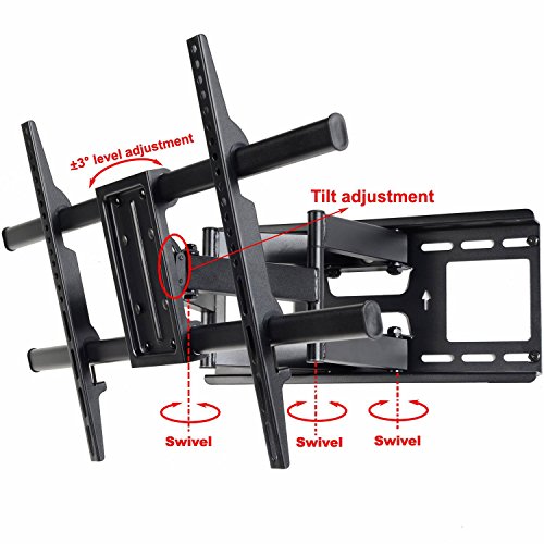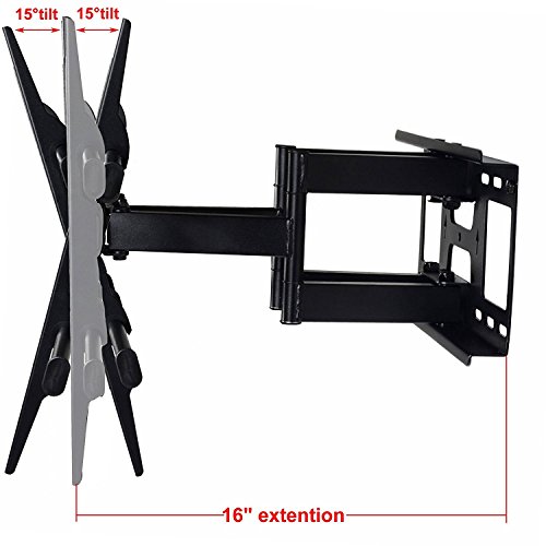 -. Feature : Articulating arm TV wall mount fits 37" 40" 42" 46" 47" 50" 52" 55" 58" 60" 62" 63" 65" 70" LCD LED Plasma display; Mounting hole pattern compatible from 200x200 300x300 300x200 400x200 400x300 400x400 600x400 684x300 684x400mm / Supports display up to 165 lbs; Adjustable tilt +15/-15 degrees and swivel side-to-side for comfortable viewing angle / Arm fold less than 3" or extend 16" from wall ; Post-installation level adjustment allows the TV to perfectly level / Easy installation and adjustment / Fit 16 inch apart wood studs; Free HDMI cable and standard mounting screws included
