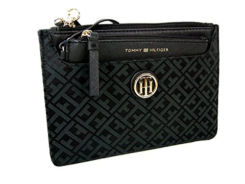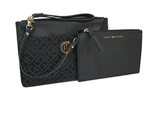 New Tommy Hilfiger TH Logo Wristlet Purse Hand Bag & Pouch 2 Piece Set Black