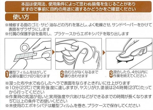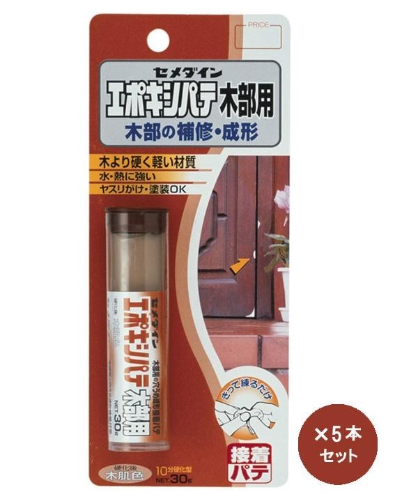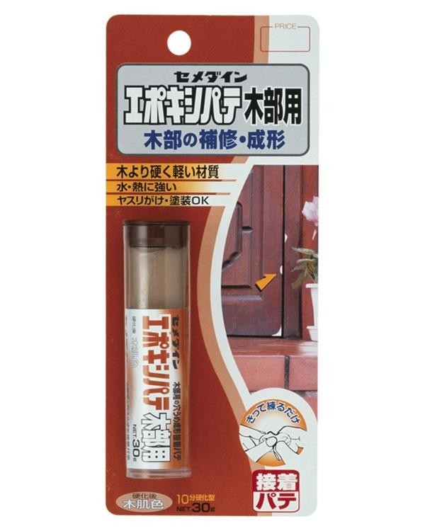 fk094igrjs木のように固まるパテです。硬化後は釘打ち・穴あけ・塗装ができます。10分間速硬化型です。 製造国:アメリカ 成分:種類:化学反応形接着剤成分:エポシキ樹脂(50%)、ポリチオール(50%) 内容量:30g×5本 仕様:硬化後:木肌色 付属品:保護手袋※お届け地域により、別途運賃がかかる場合やお届けできない場合がございますので、お問い合わせ下さい。