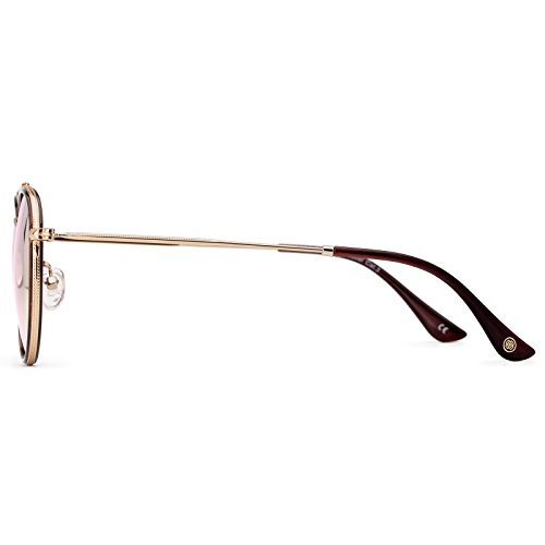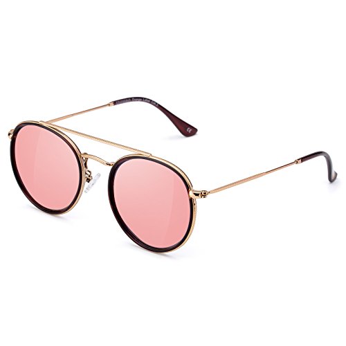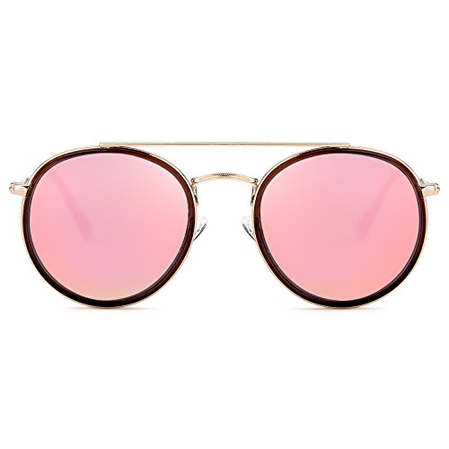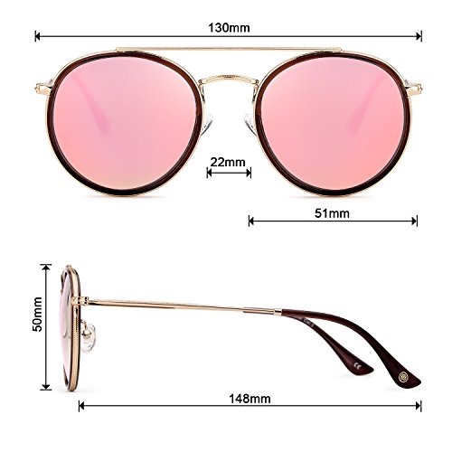 UNIQUE FASHION DESIGN: metal round frame stands out with unique double bridge design & barbie pink color coating lens, will give you a whole new fashion look. The frame and arms are using the exquisite embossing craftwork that makes the sunglasses so unique and stylish.