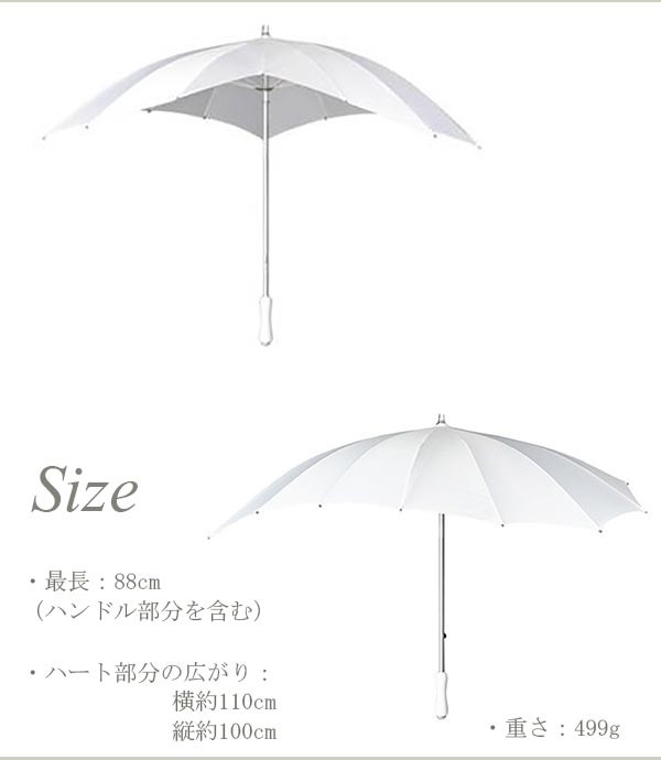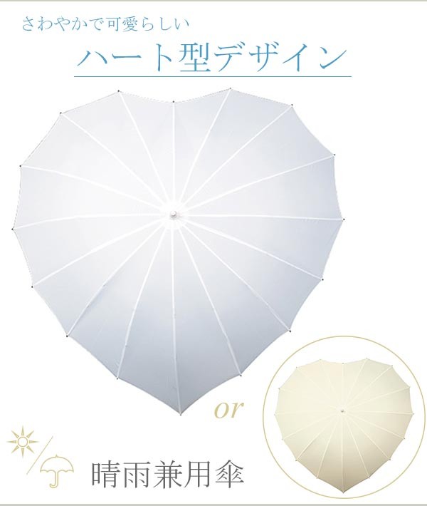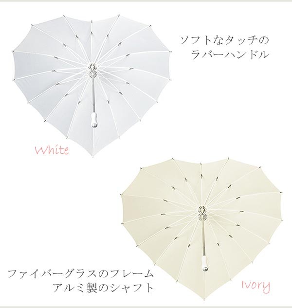 【ウェディングにぴったりの” ハート型 アンブレラ ”です!】ハート型のロマンティックな傘です。ファイバーグラスのフレームとアルミ製のシャフトで、軽い仕上がりです。また人間工学にもとづく、ソフトなタッチのラバーハンドルとなっています。日傘としても、雨傘としても両用でお使いいただけます。野外のウェディングでの雨に備えてもご準備いただくと安心です。 ウェディングドレスのデザインやウェディング会場を選ばずお使い頂けます。また普段使いとして、コーディネートをお楽しみください。【検索キーワード】ウェディングドレス/ウエディングドレス/白ドレス/マリッジ/ブライダル/ガーデンウェディング/フォトウエディング/花嫁/新婦/ブライズ/挙式/結婚式/披露宴/パーティ/パーティー/チャペル/教会/人前式/セレモニー/海外/リゾート/ホテル/式場/2次会/1.5次会/前撮り/アクセサリー/ヘアアクセ/ウエディング小物/ウェディング小物/Wedding/Bridal/ギフト/プレゼント/贈り物/花/フラワー