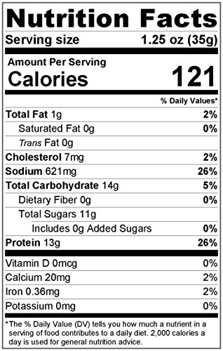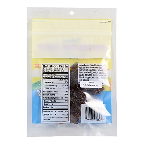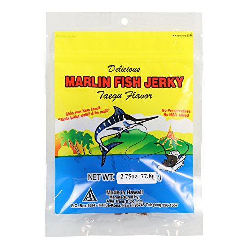 -. Binding : Misc. -. Brand : Hawaii Snacks -. EAN : 0746033900527 -. Feature : Made in Hawaii / Resealable Bag 2.75 oz / No preservatives or MSG / No Trans Fat / No Saturated Fat -. IsAdultProduct : 0 -. Label : Asia Trans & Co -. Manufacturer : Asia Trans & Co -. PackageQuantity : 1 -. ProductGroup : Grocery -. ProductTypeName : GROCERY -. Publisher : Asia Trans & Co -. Size : 2.75 Oz -. Studio : Asia Trans & Co -. Title : Hawaiian Marlin Fish Jerky Taegu 2.75 Oz -. UPC : 746033900527