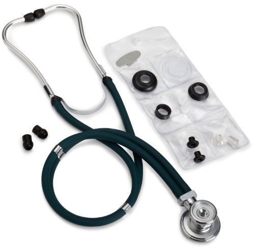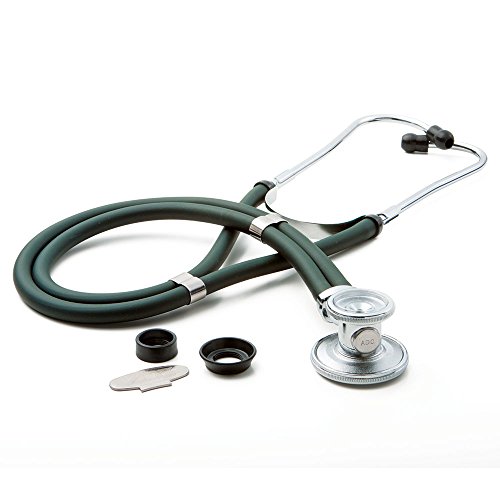 ReleaseDate : 2017-03-12 Studio : American Diagnostic Corporation Publisher : American Diagnostic Corporation Binding : Misc. Product Description One of the most popular scope styles on the market, the sprague has 5 interchangeable chestpiece fittings, an adult and pediatric diaphragm, and three bells (1 1/4", 1", 3/4") for complete diagnostic capability on most patients. Double tube design, aluminum binaurals, 22" tubing. Complete with an accessory pouch containing the bell chestpieces, chestpiece key, 2 spare diaphragms, and one pair of silicon eartips. Weights 7 oz. 5 yr warranty. Overall length 30". Inspected and packaged in the USA. 0