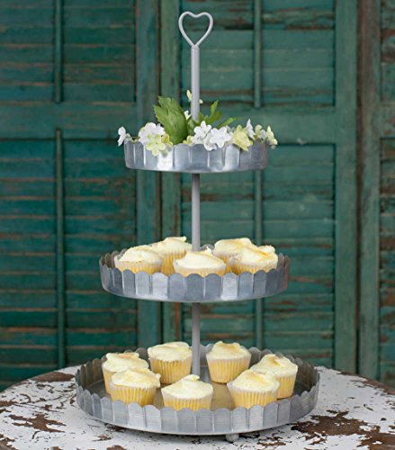 -. Feature : Features galvanized metal trays for vintage charm / Heart-shaped finial adds a pretty, romantic touch making it perfect for weddings / Stand measures 9¾" in diameter x 17" tall / Collapses for compact storage and finial provides for easy transportation / Large Tray: 9 3/4" diameter, Middle Tray: 7 1/2" diameter, Top Tray: 5 3/4" diameter