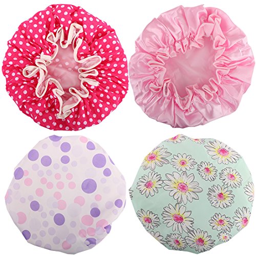 -. Feature : Great Value - Comes in a set of 4 shower caps as shown in images / Double Layer Protection - High quality PEVA nylon exterior layer and soft fabric lining / Dry and Comfortable - Keeps hair fully dry during shower and spa time / Extremely Stretchable Elastic - Easy to wear and remove / One size fits most - Elastic diameter: 40 cm / 15.8 in (unstretched)