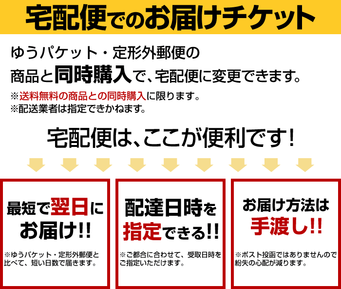 ●ゆうパケット、定形外郵便での発送商品を+390円で宅配便に変更できるチケットです。●最短で翌日にお届けすることができます!●配達日時を指定することができます!●配送人から手渡しで商品を受け取ることができます!●お支払い方法で代金引換がご利用いただけます!