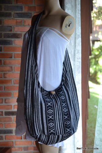 Hand made and crafted from handwoven 100% cotton, this cross-body hobo bag is a classic Thai design yet each is One of a Kind. The front and back of the bag consists of hand woven bands of lively colors with extra long shoulder straps. Wear as a cross-body bag or short tie the straps for a shoulder carry. Zippered main compartment, black lining, and inside zippered pocket. PLEASE NOTE: The design and colors pictured are accurate with the bag you will receive. However, due to fabric cutting, there may be some variation to the pattern layout. Size: 17" by 12" by 8.5", 21" vertical drop strap