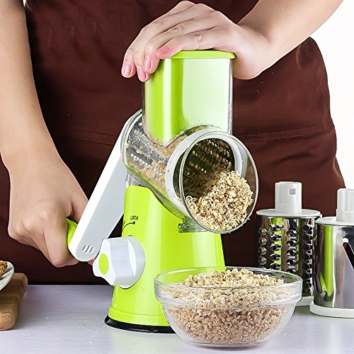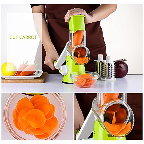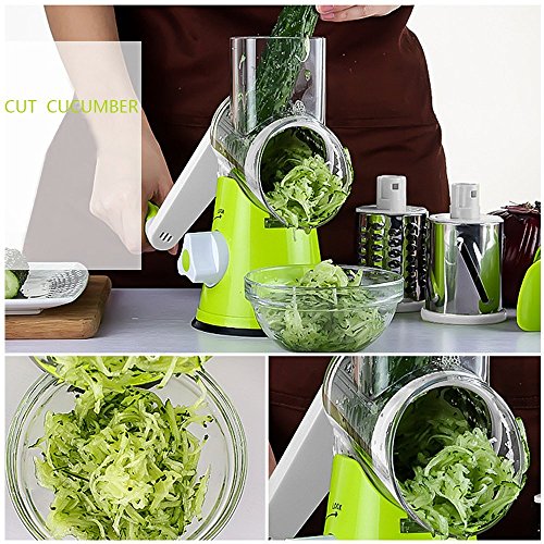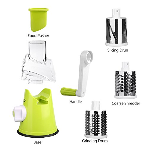 Vegetable Mandoline Chopper, QT Manual Hand Speedy 3 Blades Vegetable Slicer, Fruit Cutter Cheese Shredder, Speedy Rotary Drum Grater Slicer with Strong-Hold Suction Cup (Green)