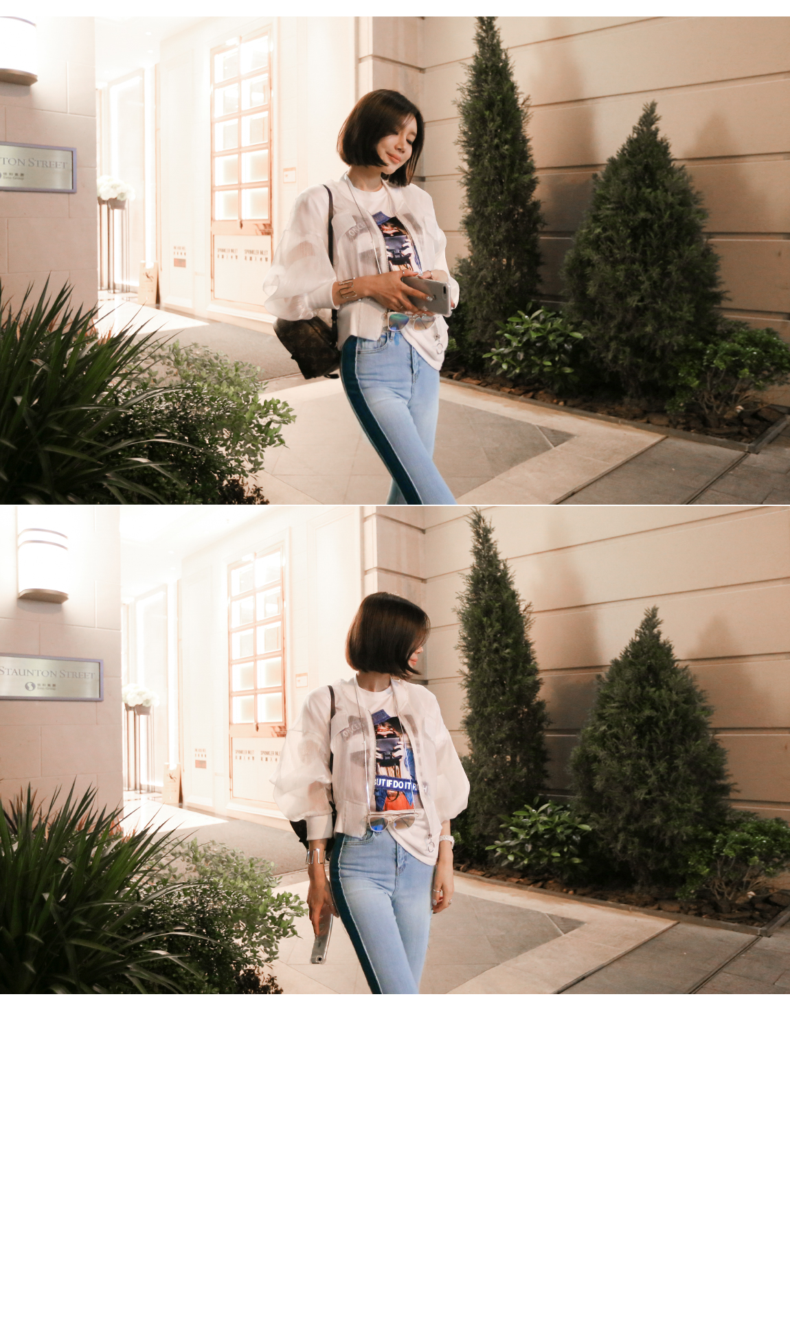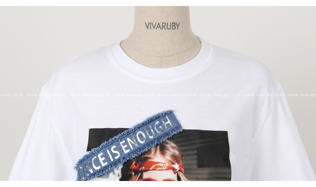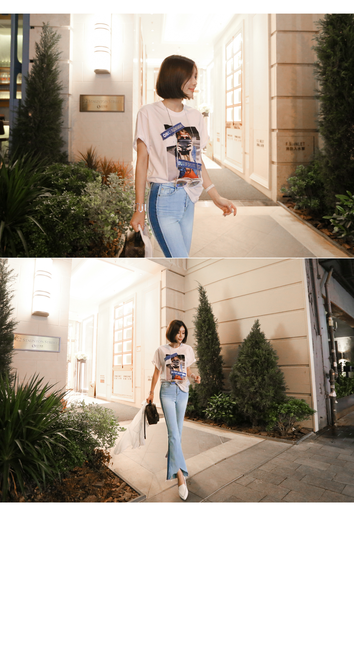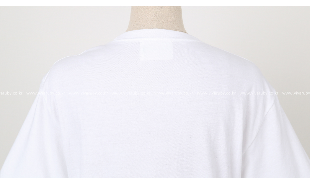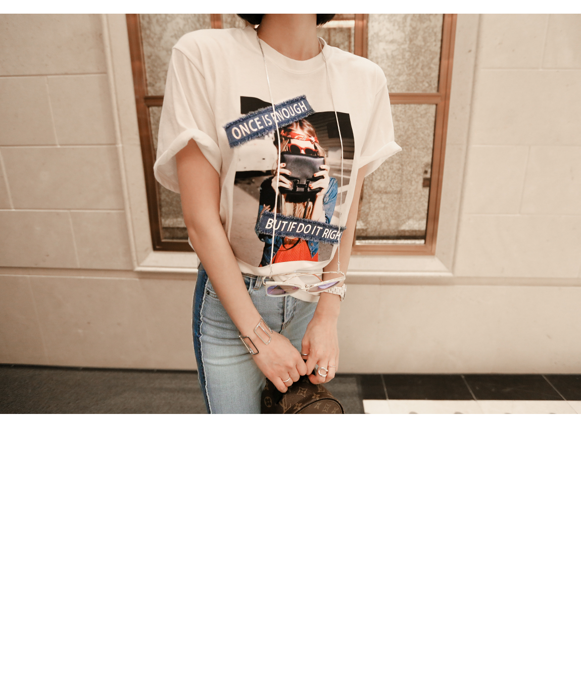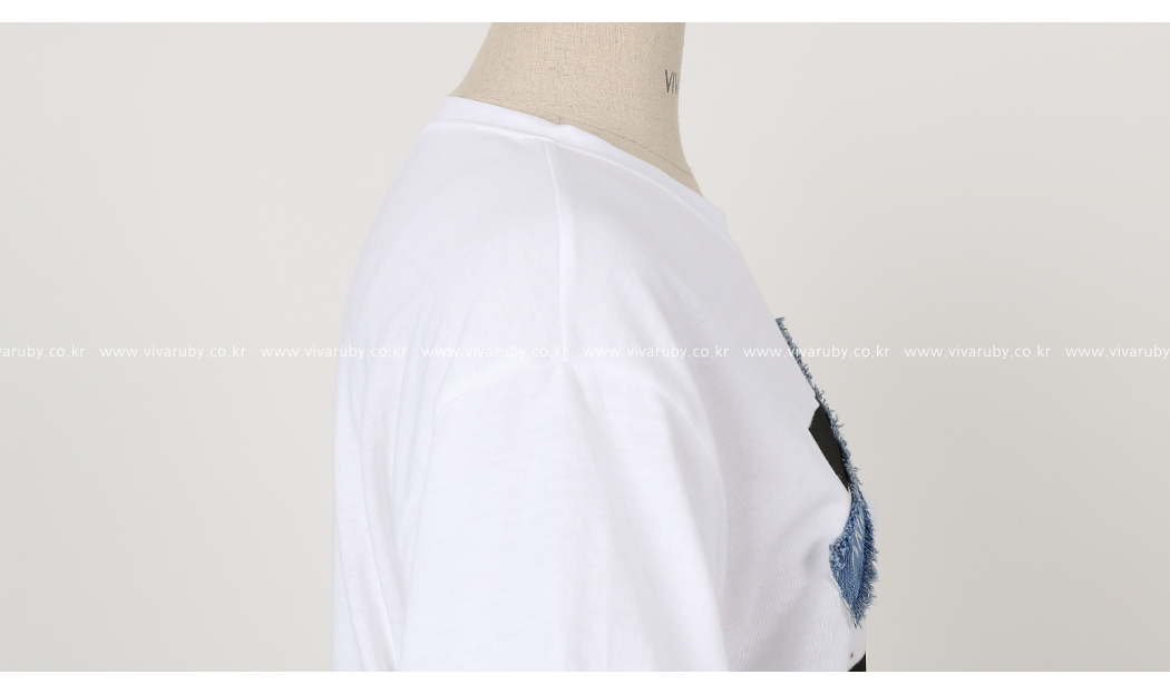 앞면의 데님 테이프와 프린팅 디테일로 유니크한 포인트를 주었어요
