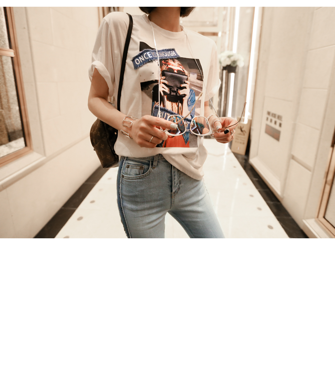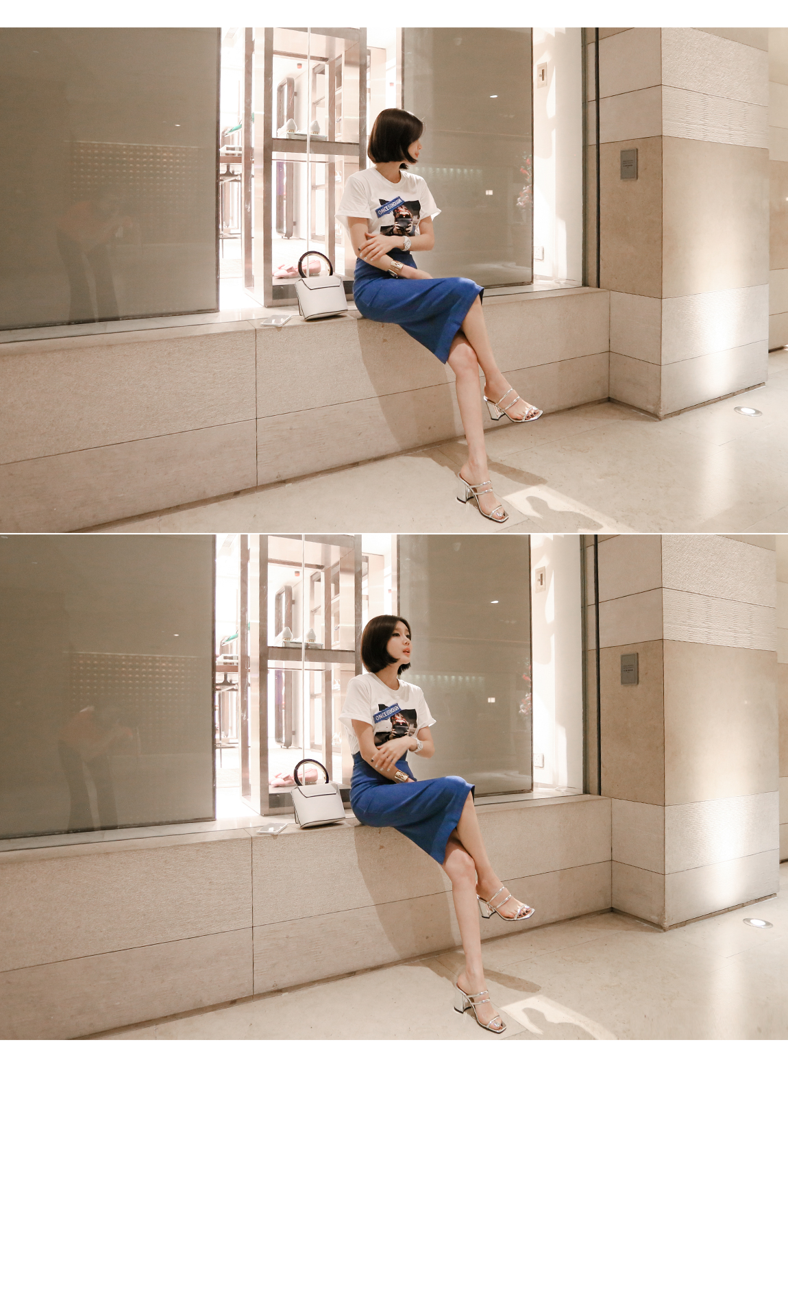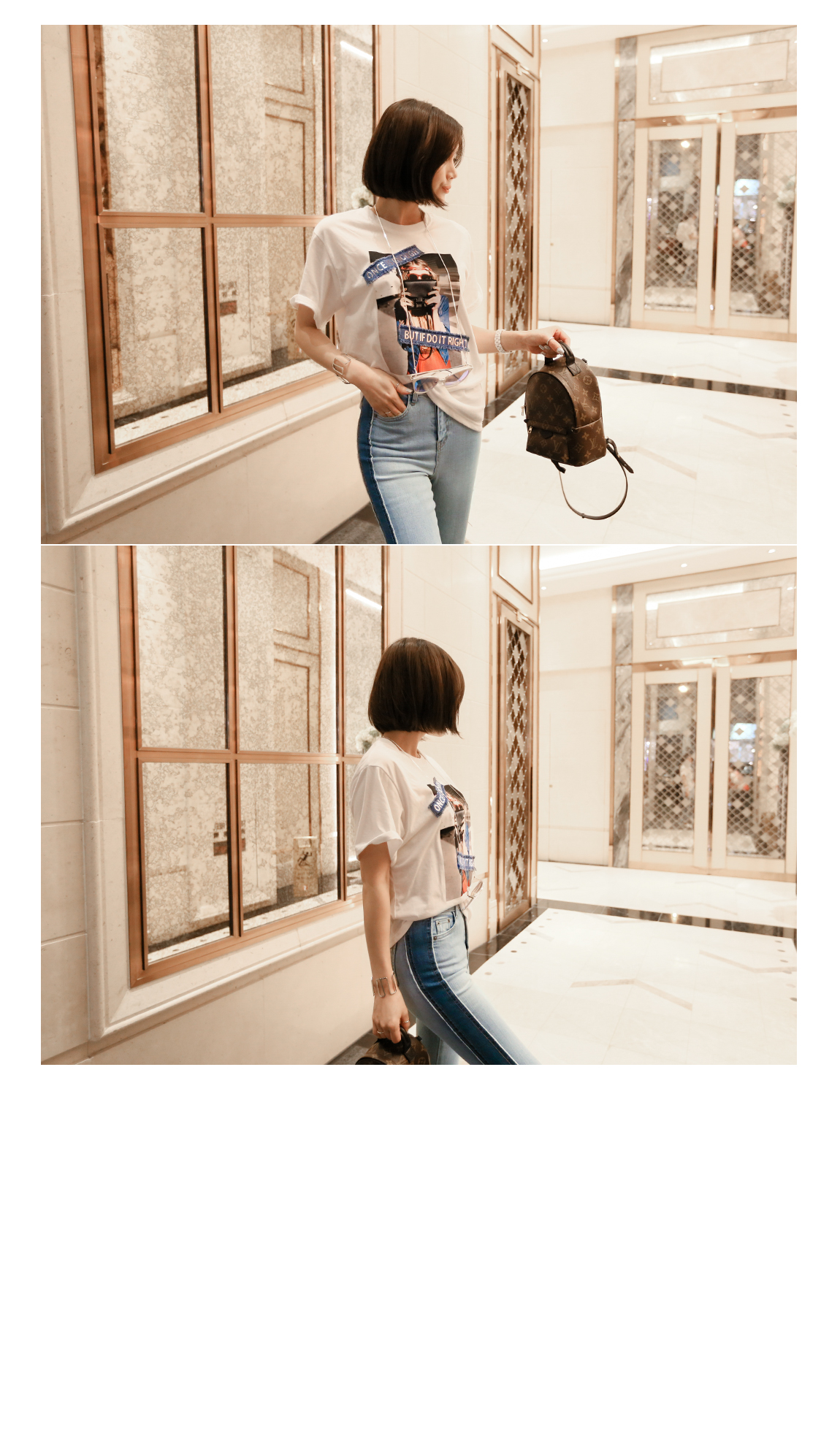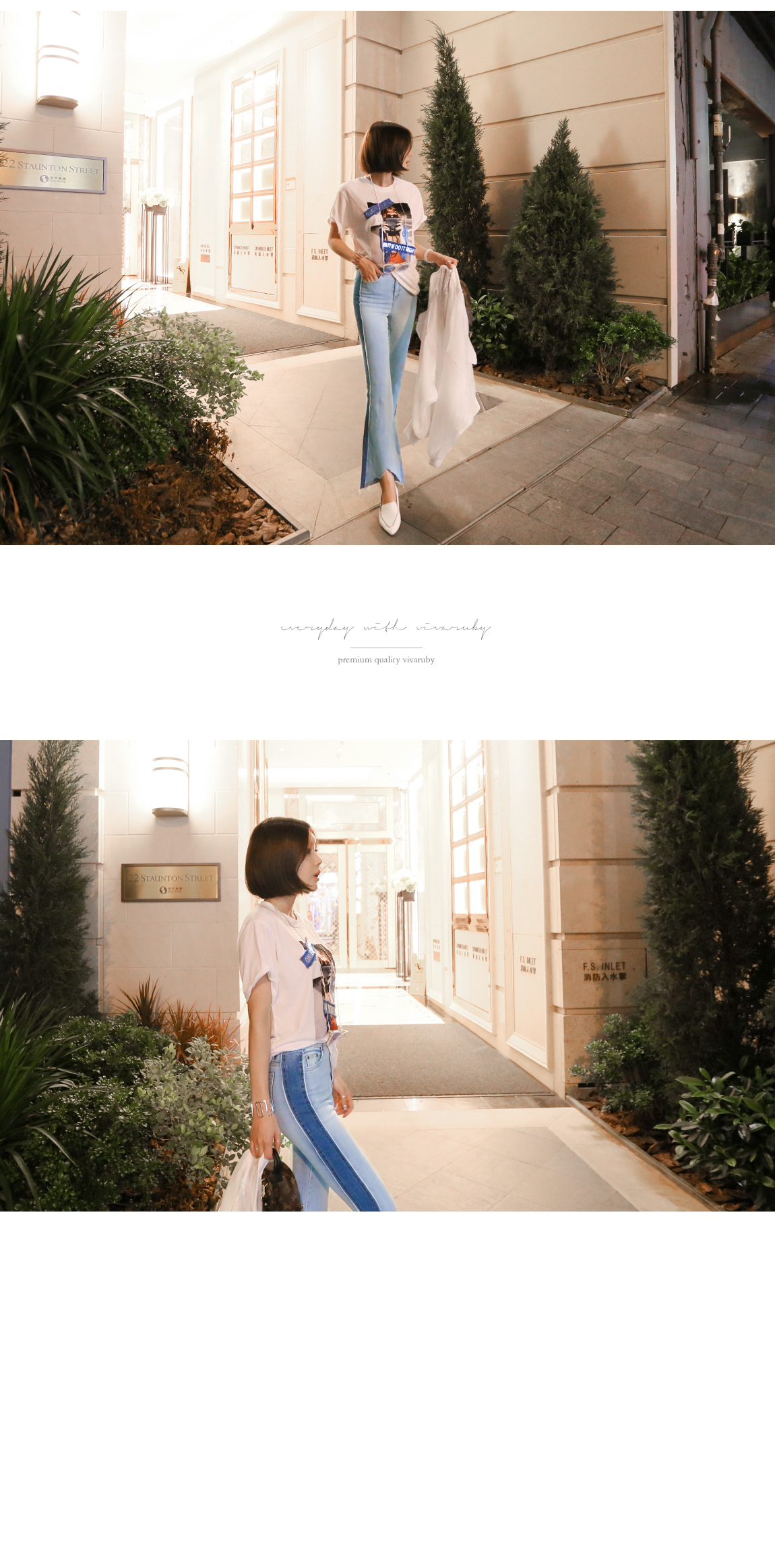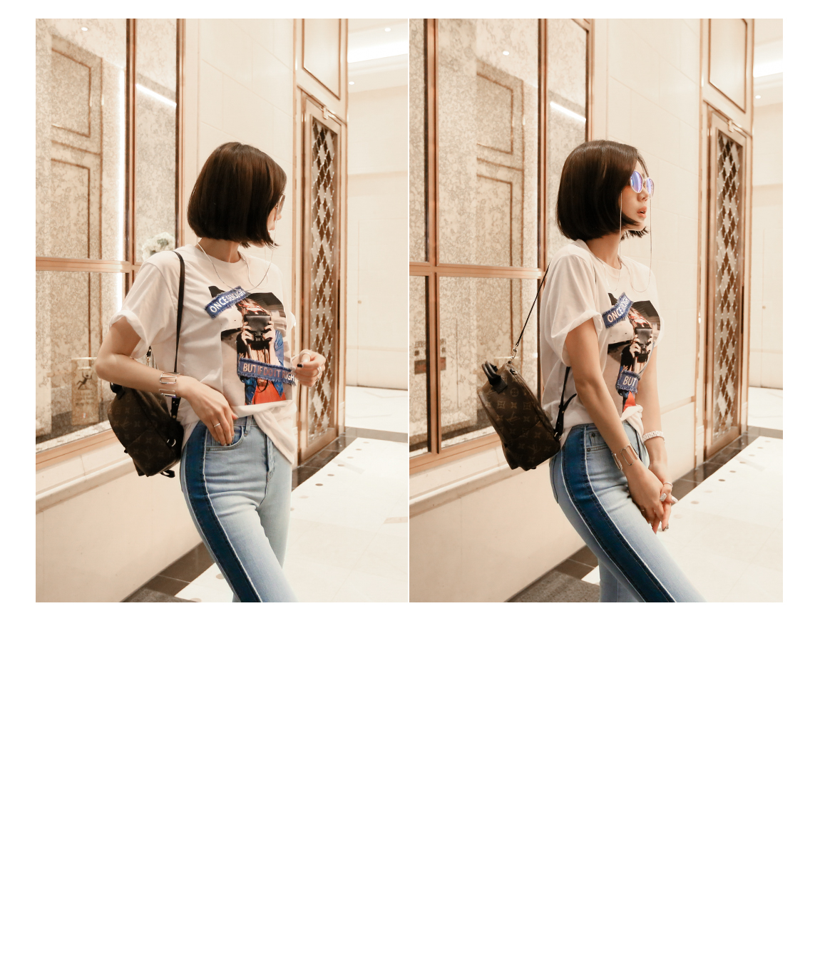 앞면의 데님 테이프와 프린팅 디테일로 유니크한 포인트를 주었어요