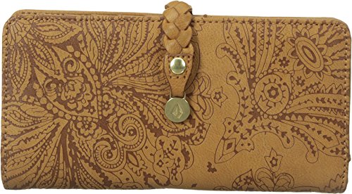 A beautiful embossed vegan leather bi fold wallet with a braided snap for closure.