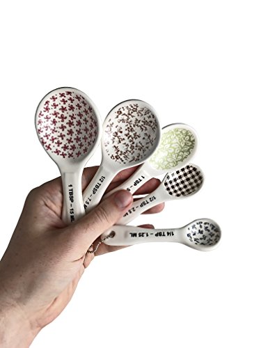 "Patterned Measuring Spoons" Stoneware Measuring Spoon Set, 1.5”W x 3”L x 1”H, 5 Spoons with Stamped Handle, Dishwasher Safe