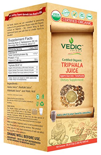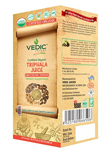 -. Binding : Health and Beauty -. Brand : Vedic -. Feature : VEDIC AYURVEDIC JUICES ARE THE ONLY TRULY USDA CERTIFIED ORGANIC JUICES. Furthermore our juices are made from fresh fruit and not from powder or flavors. / TRIPHALA IS THE PERFECT COMBINATION OF the three fruits: Amalaki (Phyllanthus emblica), Bibhitaki (Terminalia bellirica), and Haritaki (Terminalia chebula). / SUPPORTS CLEAN COLON AND DETOXIFICATION - Triphala uniquely cleanses and detoxifies at the deepest organic levels without depleting the body's reserves making it one of the most valuable herbal preparations in the world.* / THE THREE FRUITS OF TRIPHALA (Harada, Amla and Bihara) each correspond to the "three humours" or "tridosha" of Indian Ayurvedic medicine.* -. IsAdultProduct : 0 -. Label : Vedic Juices -. Manufacturer : Vedic Juices -. PackageQuantity : 1 -. ProductGroup : Health and Beauty -. ProductTypeName : HEALTH_PERSONAL_CARE -. Publisher : Vedic Juices -. Studio : Vedic Juices -. Title : Triphala Juice 500 Milliliter USDA Certified Organic Juice by Vedic Juices