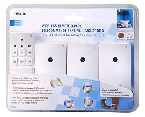 The Indoor Wireless Remote 3-pack turns appliances on and off from up to 66 ft. away. Operate 3 different home appliances from across the room, or another area of your house, using one remote control. The signal from the remote travels through walls, windows or doors. Use the remote outlets in one room or multiple locations; beneficial for the mobility-impaired and anyone who just wants a one-touch, convenient way to turn lighting or appliances on and off. This package includes (3) receivers each with a space-saving grounded outlet, (1) transmitter and 12-Volt battery. The unit is compatible with compact fluorescent lighting (CFL) and LED bulbs, and is cUL certified for quality assurance. The Indoor Wireless Remote 3-Pack offers a fast, tool-free set-up and is easy to operate by the simple touch of a button. Use it to turn on lamps, activate holiday displays, operate electric fans and so much more. Perfect for hard to reach lamps and holiday decorations. The Woods brand of timers and home controls bring simplicity to your life, by maximizing convenience, security and energy savings. TOLL FREE HOTLINE, 1-800-561-4321. If you have immediate questions about application, installation, troubleshooting, or a damaged component, please call CCI Consumer product hotline at 1-800-561-4321 or email questions to: CCI.ConsumerSupport@southwire.comFeature