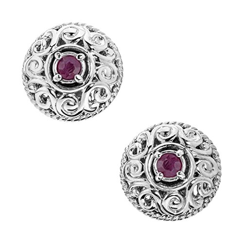 These button earrings are a perfect way to personalize your love. Your birthstone, a significant other's birthstone, or your children's birthstone can hang delicately from your ear with these fabulous earrings. Sterling silver, plated in rhodium, in a filigree and rope border design lay the perfect backdrop to prong-set, glowing genuine gems displayed in the center.Feature