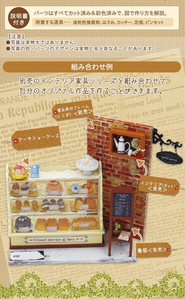| 見ているだけでも楽しい、美味しそうなケーキやパンが並ぶショーケースのミニチュアキットです。単体でインテリアとしても、ミニチュア作品のアクセントとしてもピッタリです。分かりやすい説明書付きなので、初心者の方でも楽しく簡単に作ることができます。 |